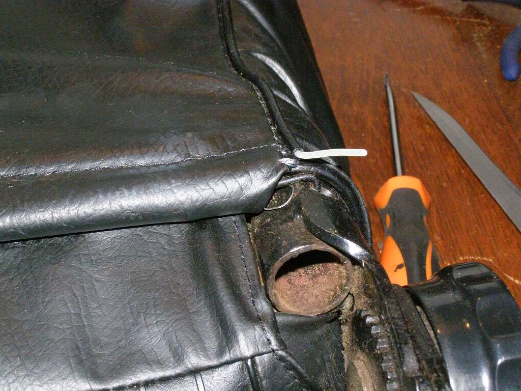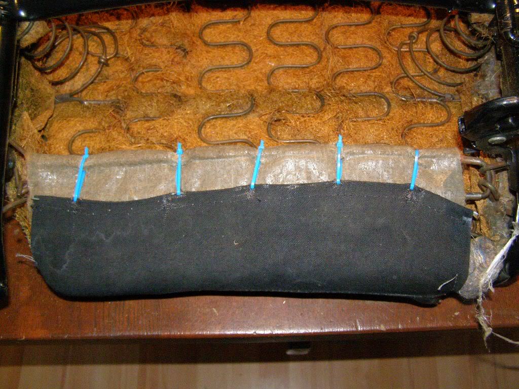 Nu aan de achterzijde het stof weer op spanning brengen. Dit kan met nieuwe nietjes, en als je die niet hebt, tie-raps. Let er wel op dat je het vastklemt om het ijzerstaafje wat erdoor loopt, anders scheurt de stof!!!
