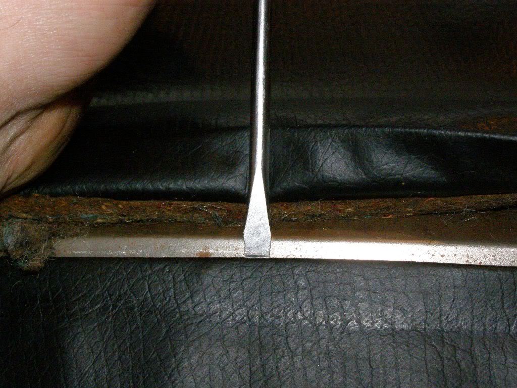 Nu nog de laatste 2 nietjes aan de onderzijde los, en de stof kan voorzichtig omhoog geschoven worden.