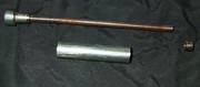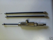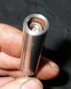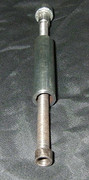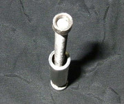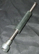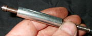 Basis is een Inbusbout M8 x 120 en een stuk rondstaal 12x55mm.De imbusbout wordt tot op een klein stukje tot 6 mm. afgedraaid en van M6-draad voorzien. Het rondmateriaal wordt eerst met 6,2 mm. doorboord (zodat de M6 er door past) en dan tot op 3 mm. met 8,5 mm. uitgeboord om zo de uitgedreven deurpen op te nemen.Het kleine drukstuk is van een M6 moer gemaakt, die op 7,9 mm. buitenmaat is afgedraaid.